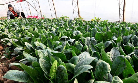 近日,在河北省邯郸市魏县“鲜蔬小镇”后西营村蔬菜大棚内,村民正在采收菠菜。胡清华 摄