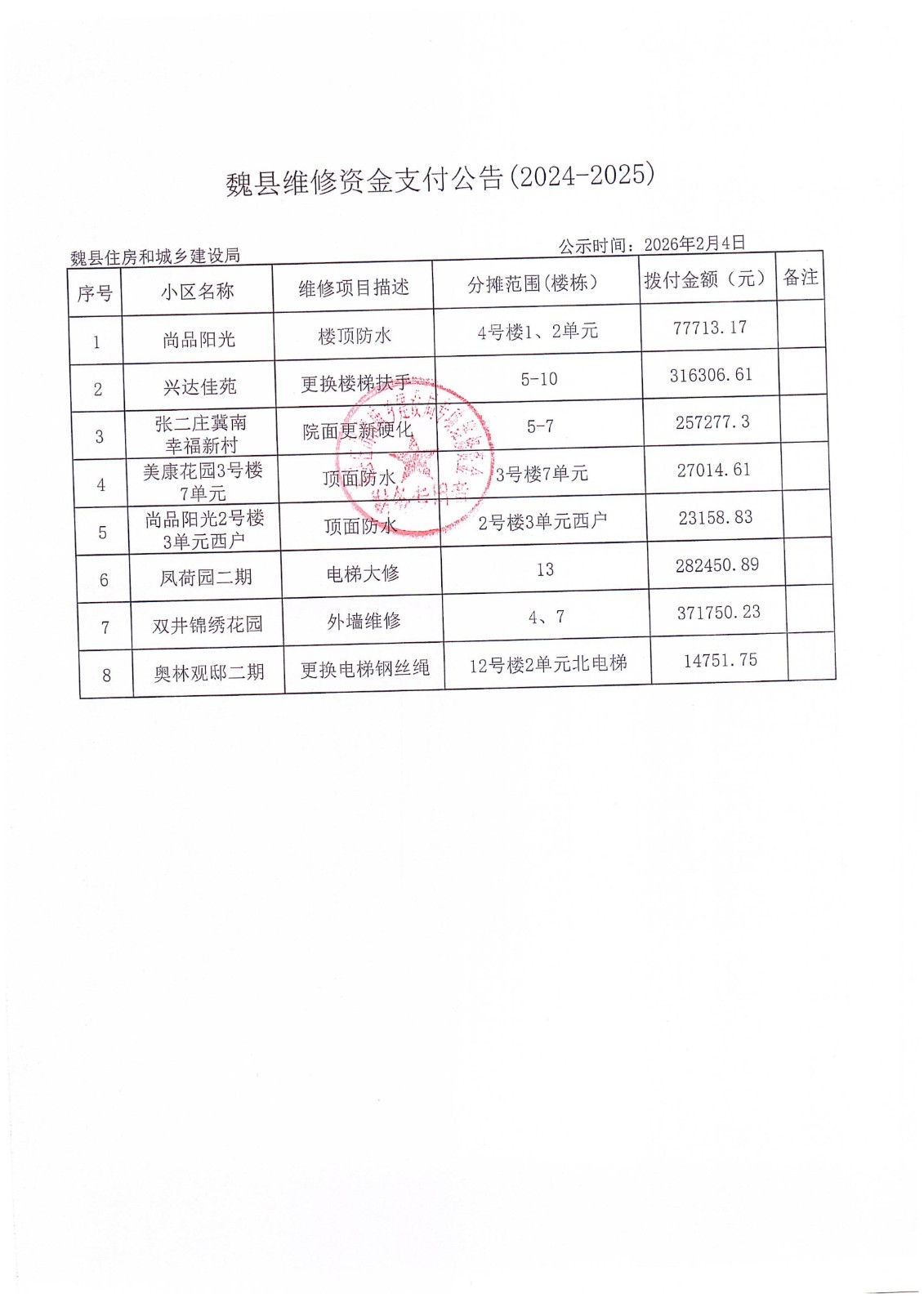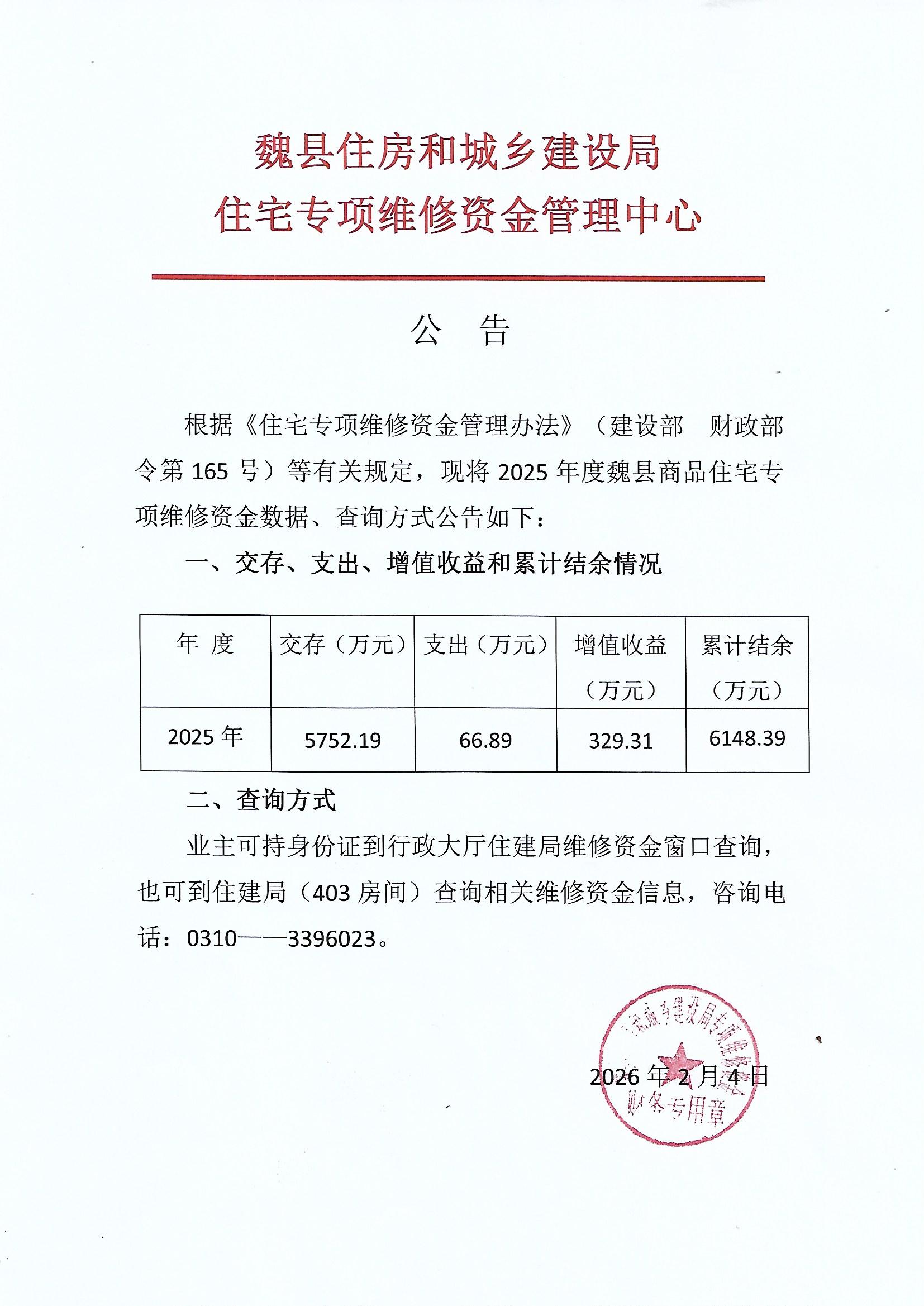 2025年度魏县主城区住宅专项维修资金数据及查询公告